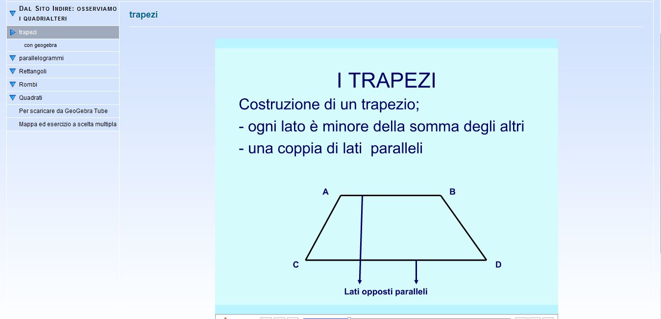 Qui potrete consolidare lo studio dei quadrilateri. Nell’applicazione è inoltre possibile consultare presentazioni, figure dinamiche create con geogebra e una mappa concettuale. È possibile eseguire altri esercizi qui
